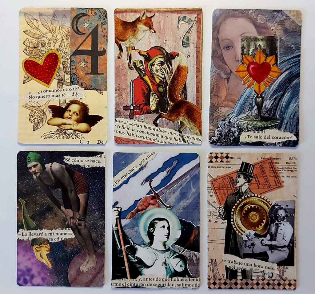 A principios de este 2023, me propuse crear mi propio mazo de tarot usando como soporte una vieja baraja española. Me interesa mucho el tarot desde una mirada artística y simbólica, no conceptual ni literal, sino como un juego de suertes en el que el azar ofrece unas imágenes que leemos al relacionarlas, (entre ellas y con nosotros mismos), y que como Apolo en Delfos, “no dicen ni ocultan, señalan”.