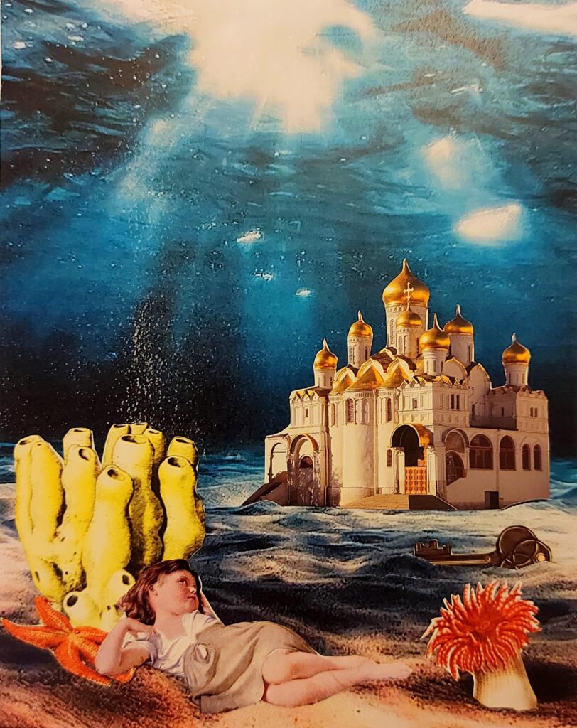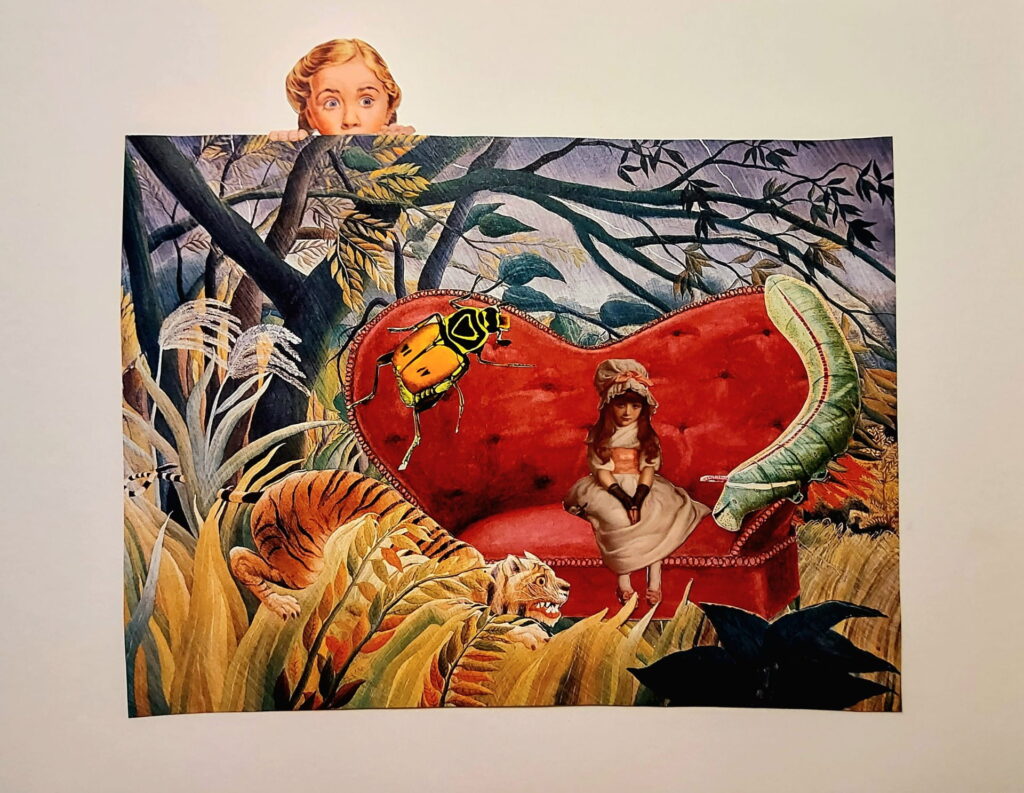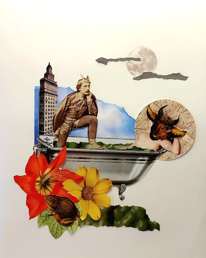 Por el momento, hago solo collage análogo. Pocas veces tengo algo claro cuando empiezo. Lo que hago es una lucha encarnizada entre la intuición y la voz que dice: “qué obvio, qué mal, eso no pega, pero qué estás haciendo?? Y eso ahí, por qué? Estás perdiendo el tiempo. Esto no vale…”. La batalla termina cuando soy capaz de leer algo, como en una tirada de cartas, como un sueño que se ha de interpretar. Un reflejo sugerente de algo mío que puedo reconocer porque, de alguna manera, lo veo fuera.