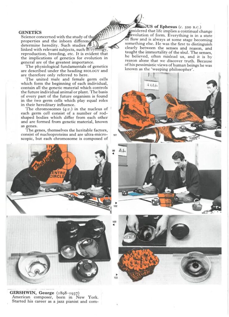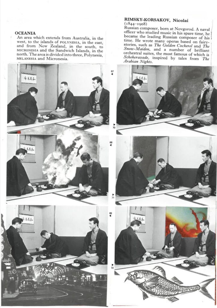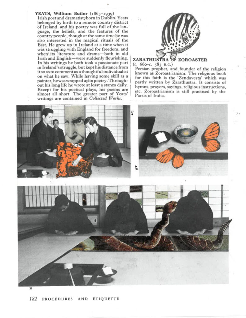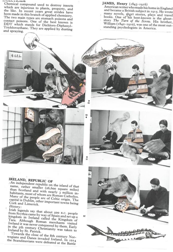 I’m an aesthetic animal and collages offer an ecstatic aesthetic puzzle to solve. As near as possible I work with found images. To do this I search for material where what’s on offer is eclectic and limited: bric-a-brac shops, charity book corners; finding my books to cut, rip and repurpose off shelves of the unwanted. Ordinarily I’m a sceptic, but when collaging I’ve an unflappable faith in a strange combination of synchronicity and reincarnation. There are few things more satisfying to me than resurrecting images, bringing pictures to life out of what’s been left for dead.