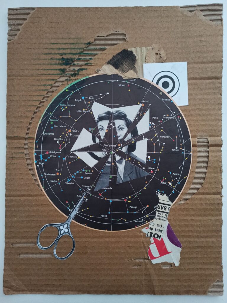 Mi primer contacto visual de un collage fue en la infancia, una amalgama de formas, colores. texturas ,que contaban historias , papeles en forma de cromos , rostros de cine que coleccionaba mi madre, una caja llena de fotos en blanco y negro , sepias, y colores desgastados , cartas , telegramas, postales , facturas, recortes de periódicos y revistas…, hoy sé que era una coleccionista de recuerdos.