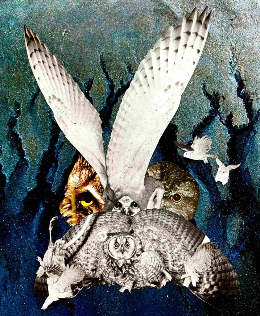 I work intuitively, based on my feelings. I start by gathering images that align with my current mood, and then I begin to associate and combine them. My work is often autobiographical. In my collages, I strive to view the world from a different perspective, uncovering new or unexpected aspects, thoughts, and emotions within myself. I like to make compositions with small images cut out of books, magazines and other mediums. It is a soothing way for me to process stimuli and concentrate.