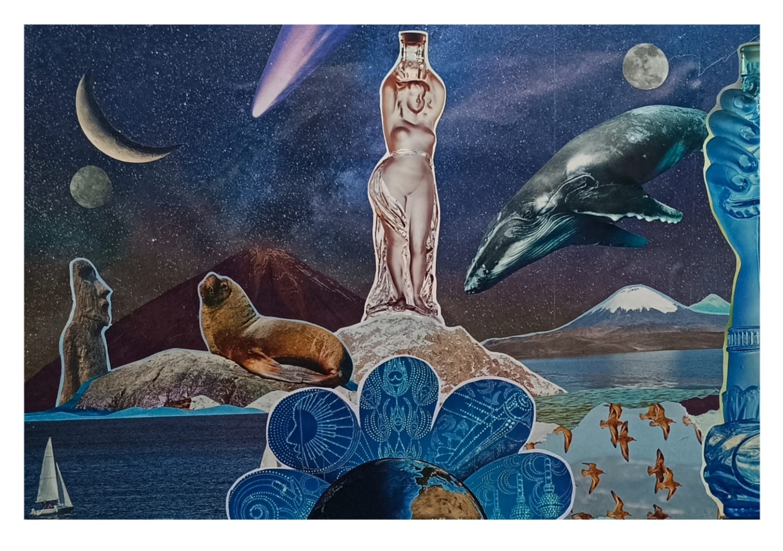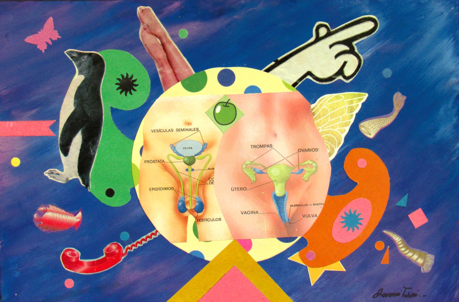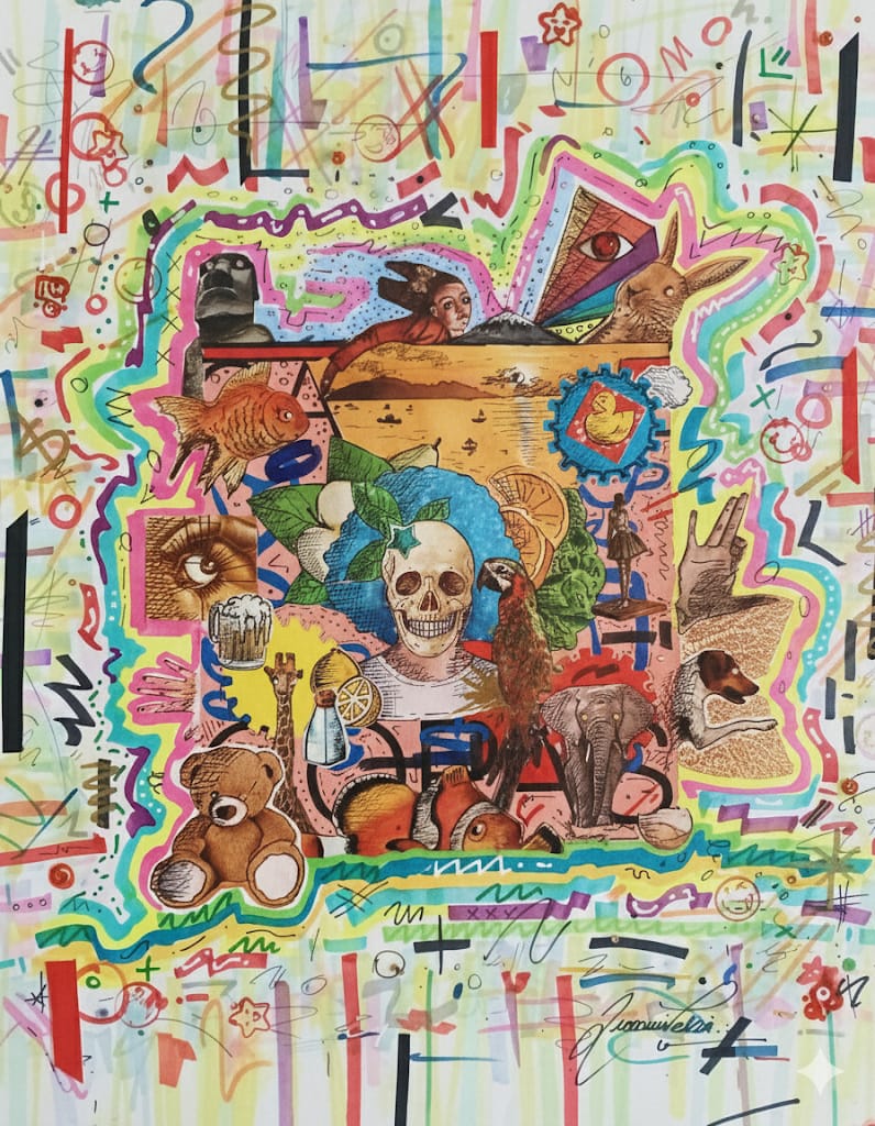 Mi obra se caracteriza por el uso del collage en técnica mixta, explorando lo kitsch, el surrealismo y el pop art como ejes estéticos. Me interesa jugar con los contrastes visuales, los símbolos y las texturas, otorgando relieve y profundidad a cada composición. Cada pieza es un espacio de experimentación, donde los materiales y colores dialogan entre sí para crear imágenes cargadas de simbolismo y narrativas abiertas.