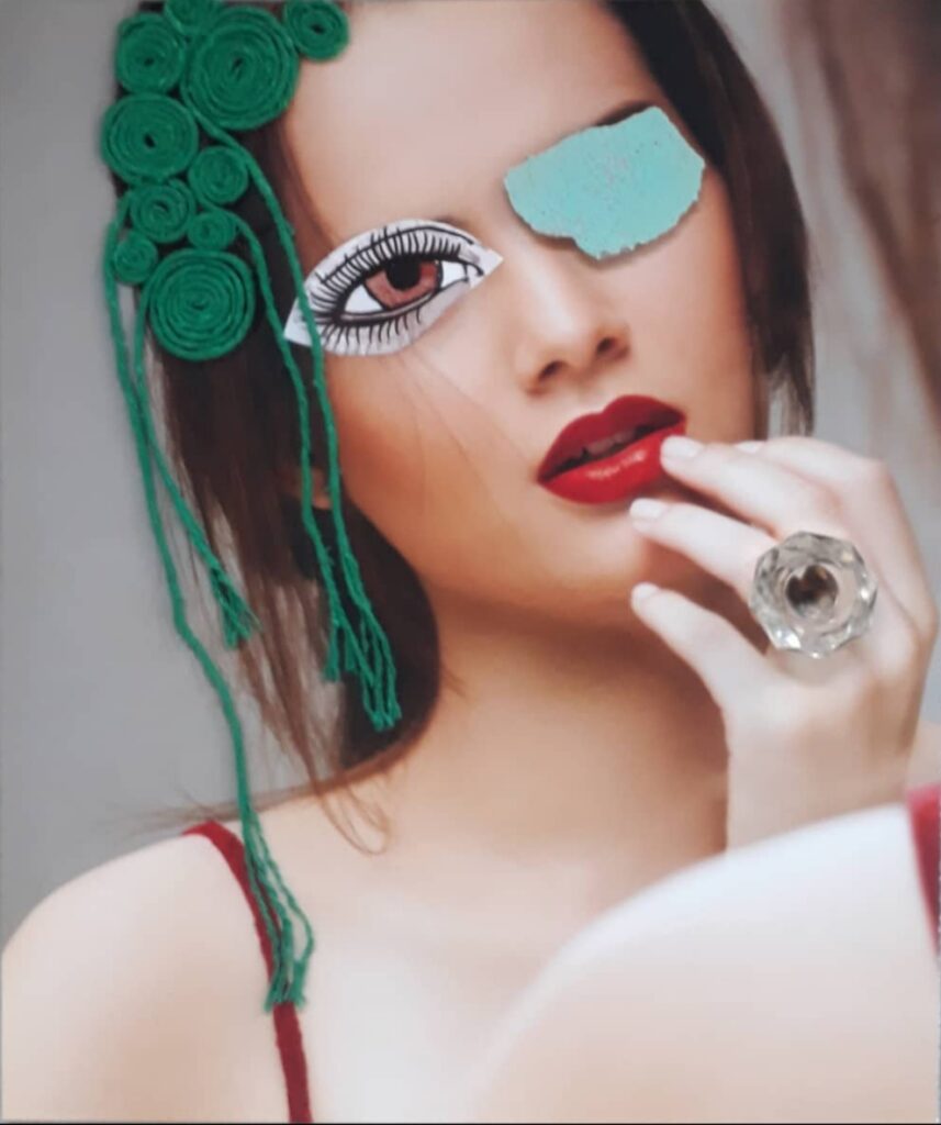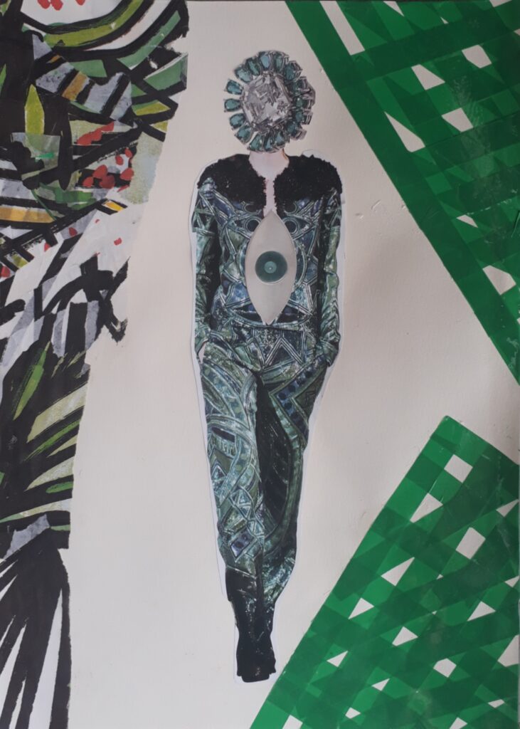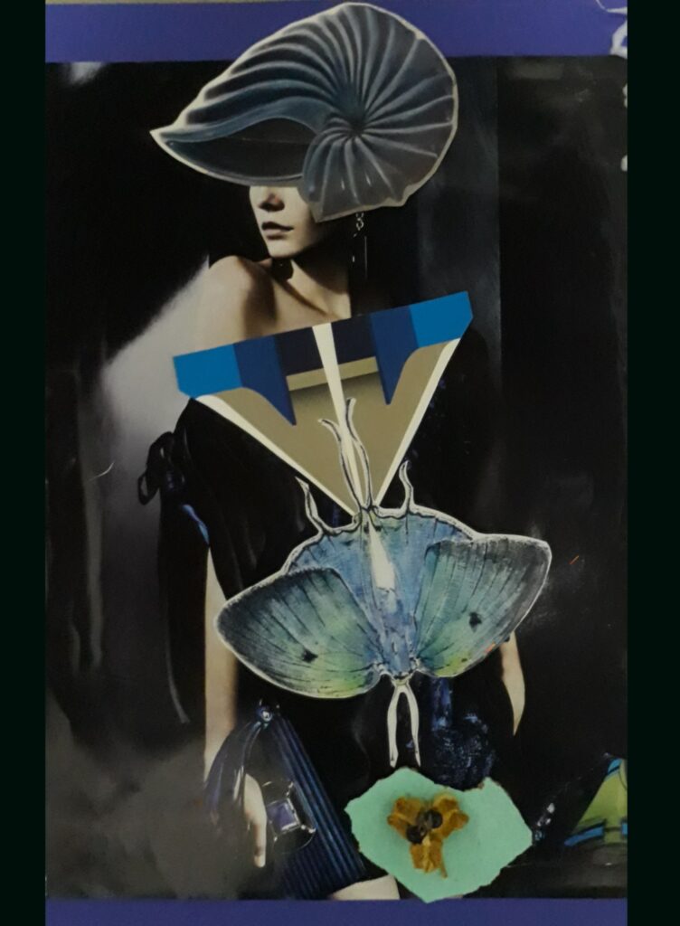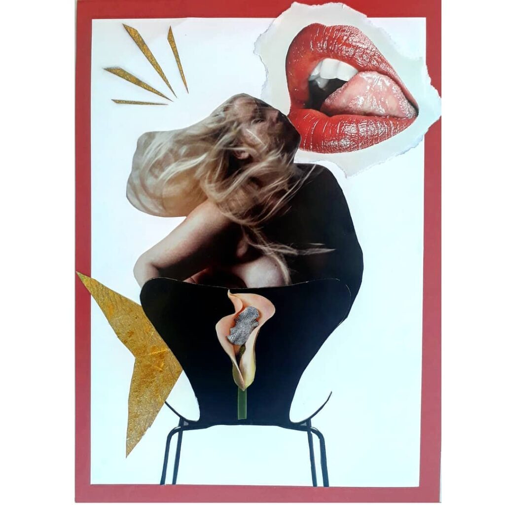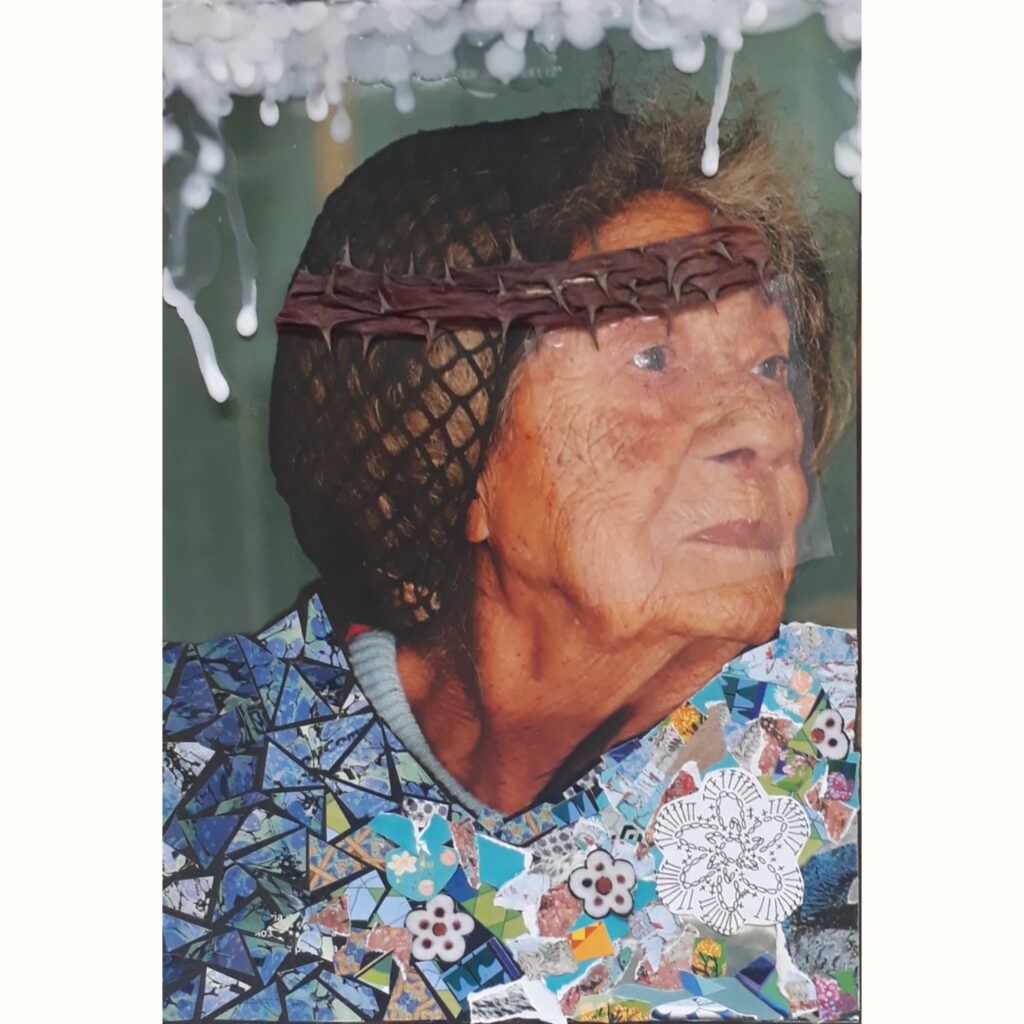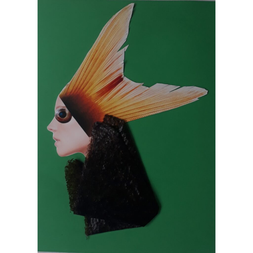 Nesta série de colagens, intitulada Métra, experimento a colagem com materiais orgânicos, como fibras de palmeira, casca de ovo, flores e plantas desidratadas e folhas de nori, buscando assim dialogar com a sabedoria ancestral das mulheres em sua relação com a natureza. Utilizo também o que chamo de “materiais do acaso”, fragmentos de objetos que encontro pelas calçadas e caminhos, os quais parecem querer contar sua história velada pela poeira das ruas e pelo desgaste do tempo. Por fim, no que concerne aos materiais, agrego fios, tecidos e cera de vela às produções remetendo a práticas femininas do tecer e do benzer.