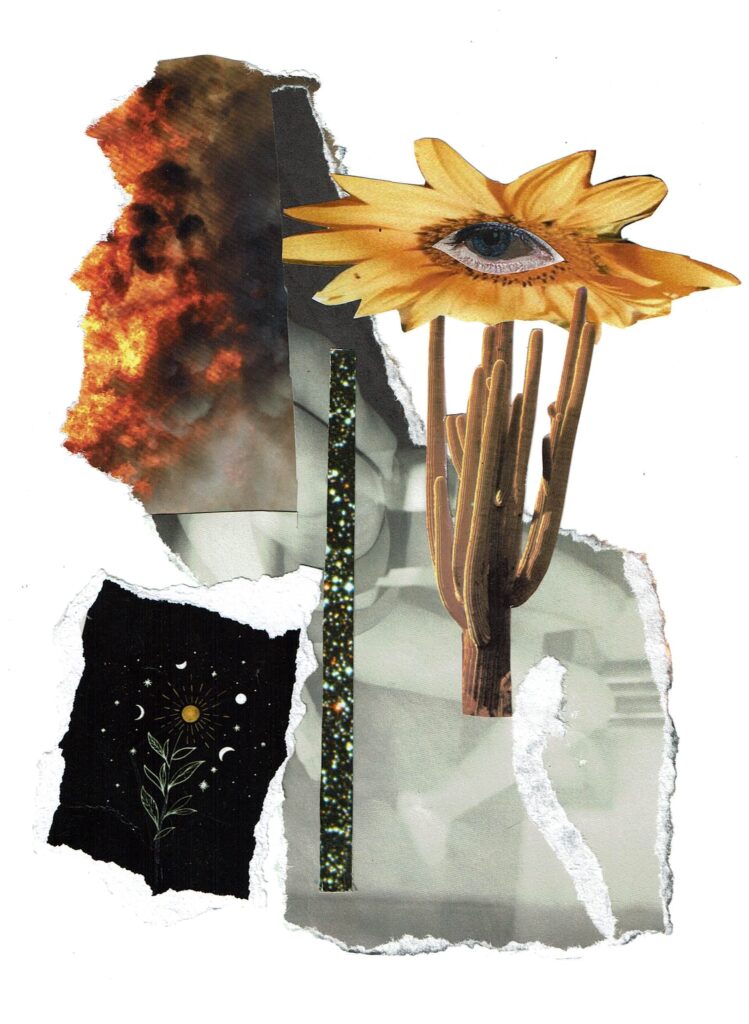 En mis collages me gusta hablar de fragmentos de vida, nuestras anécdotas, momentos, recuerdos, sueños y lo fugaz que es todo, sobre todo me gusta hablar del sentir de la vida. De que, como personas, podemos abrazar nuestros sentimientos, de no tener miedo a empezar de nuevo. Me inspiran los aprendizajes, la música, la naturaleza, las tecnologías, mis amigos y mi familia. Creo que mi estilo es más minimalista, pero me encanta probar con diversos materiales, desde recortes de revista, fotografías de mi autoría, material botánico, basura o material reciclable, pero también en ocasiones uso herramientas digitales y realizo algunas animaciones. Para mí, lo más noble del collage es que te permite usar cualquier material para crear.