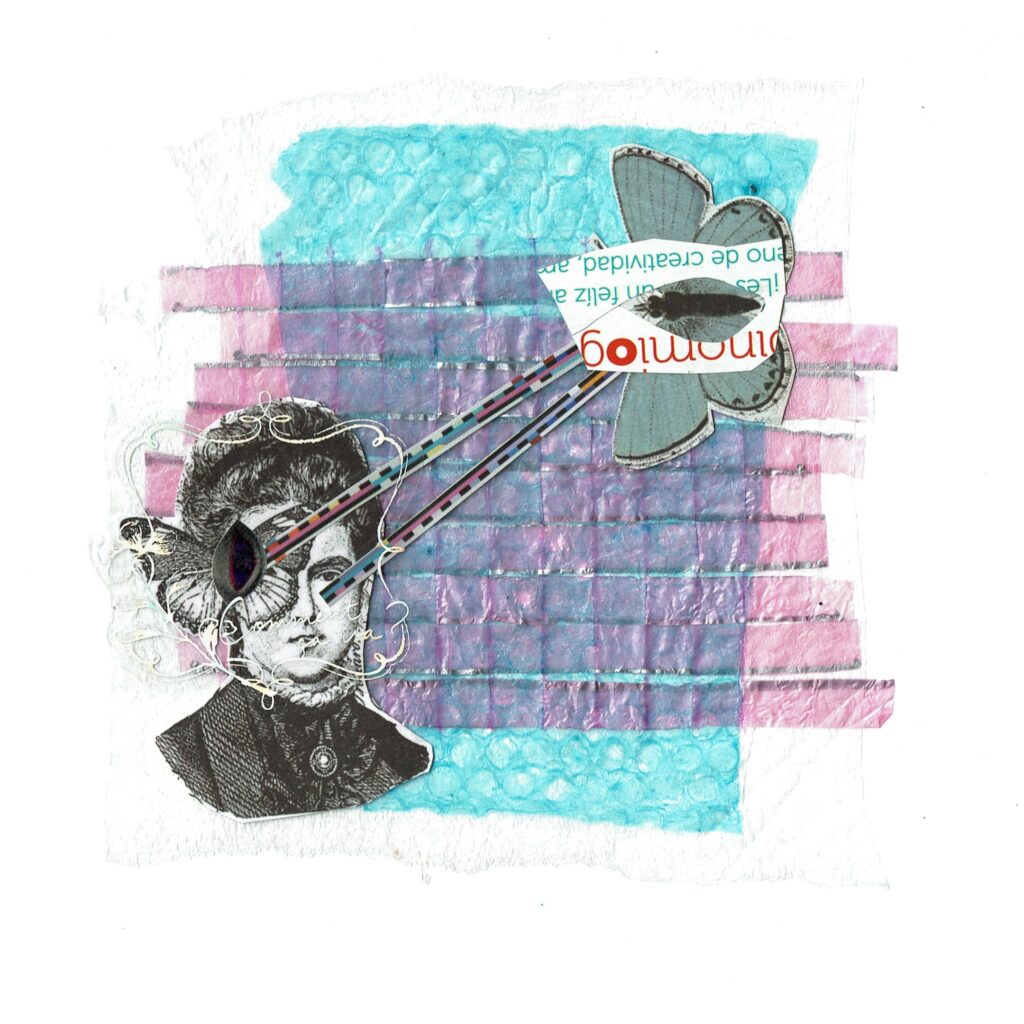 Siento que el collage entró en mi vida como un redescubrimiento profundo, ayudándome a aceptar la vida tal como es, sin más pretensiones. Desde una temprana edad, sentía una afinidad por atesorar recuerdos en forma de envolturas llamativas, bolsas con diseños interesantes, flyers de fiestas y eventos, y por supuesto, revistas. En algún momento del pasado, decidí deshacerme de todos esos objetos, sin darme cuenta de que en realidad eran un tesoro destinado a ser utilizado en esta técnica que infunde nuevas capas de significado a las imágenes, objetos y texturas. Llevo ya dos años sumergido en el mundo del collage, después de haber completado el taller “Las pioneras del collage y tú”.