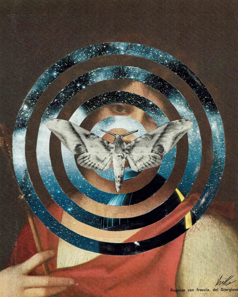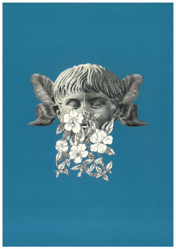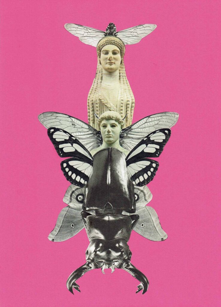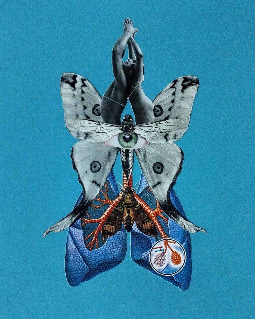 I really enjoy making metamorphic creatures, I combine different types of element: part of the human body, insects, statues, flowers, and what comes out, it’s always something that I make for aesthetic or meaning; and in most of the collages from that series (Metamorphosis) you can see butterflies mostly; also, you can find those little winged creatures, in one of my series called “Blinded butterfly figure”.