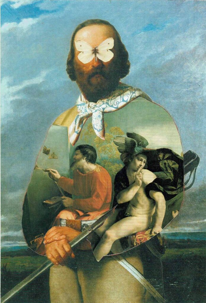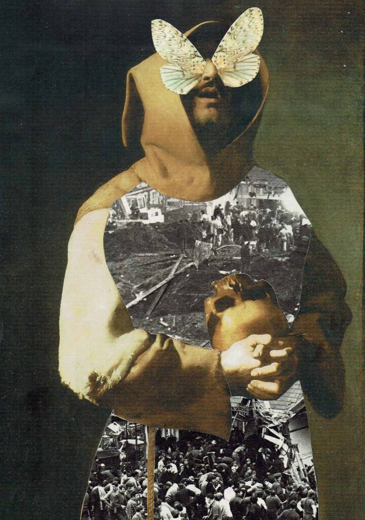 One in particular, is called “I pray for not see deaths anymore”, where the main source is a painting of San Francesco holding a skull in his hands, looking up, and I put a landscape representing some ruins after a catastrophe, I made this in purpose, a man who is praying for not see death again, and so the butterfly put itself on his eyes.