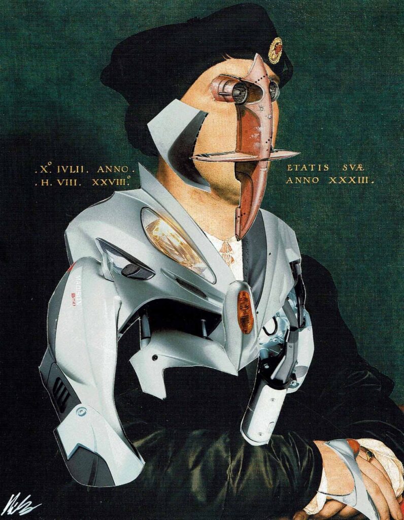 Last installations I’m experimenting on, is transforming old portraits into a kind of “cyberpunk” subjects, putting elements that make them like human beings from the future.