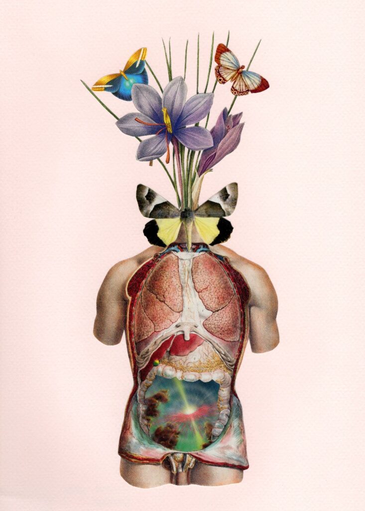 Mi trabajo en collage es una exploración íntima del mundo interior, donde se entrelazan emociones, recuerdos y paisajes cósmicos. Utilizo imágenes del cuerpo humano, la naturaleza y el universo para construir escenas que habitan entre lo onírico y lo simbólico. Mi estilo combina elementos surrealistas con una estética nostálgica, inspirada tanto en la astronomía como en los procesos de sanación emocional. Cada obra busca abrir una ventana al inconsciente, como un lenguaje silencioso entre lo que duele y lo que desea florecer.