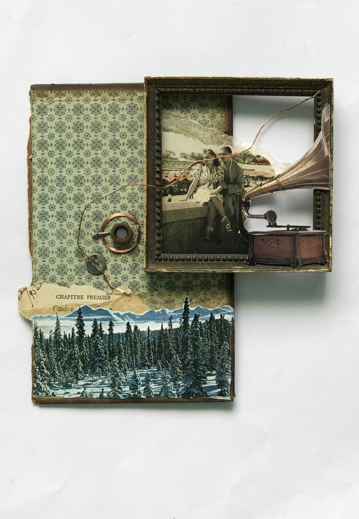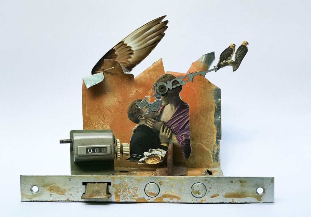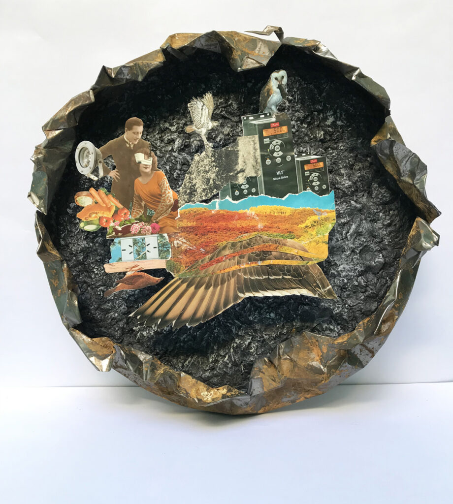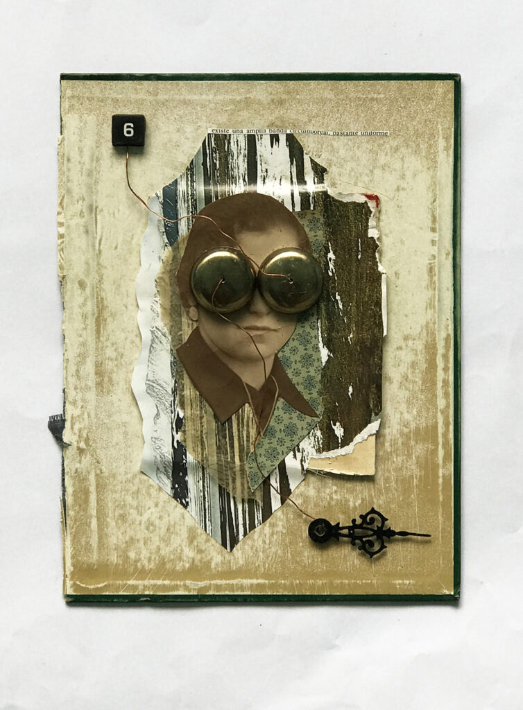 Al collage creo que llego sin darme cuenta , o sin nombrarlo. En un momento me doy cuenta que la dinámica del collage era lo que más me llamaba la atención cuando observaba obras de arte ( que no necesariamente eran collages en si mismas, pero quizás tenían algunos elementos como parte de la totalidad ) Llego desde un lugar lúdico, armando fondos y figuras y luego pegándolos sobre objetos, hasta que luego me puse a investigar en pensarlos sólo como obra, empiezo a hacer talleres, a producir muchísimo, primero solo con papel, después de un tiempo incorporo los objetos, y ya me voy al assemblage.A esto se sucedieron casi sin darme cuenta un montón de exposiciones, colectivas e individuales, festivales, etc , se abrió un mundo entero (o no tan entero, pero mundo al fin) de collage. Hoy siento que es una dinámica que siempre me acompañó simbólicamente en muchos aspectos de mi vida.