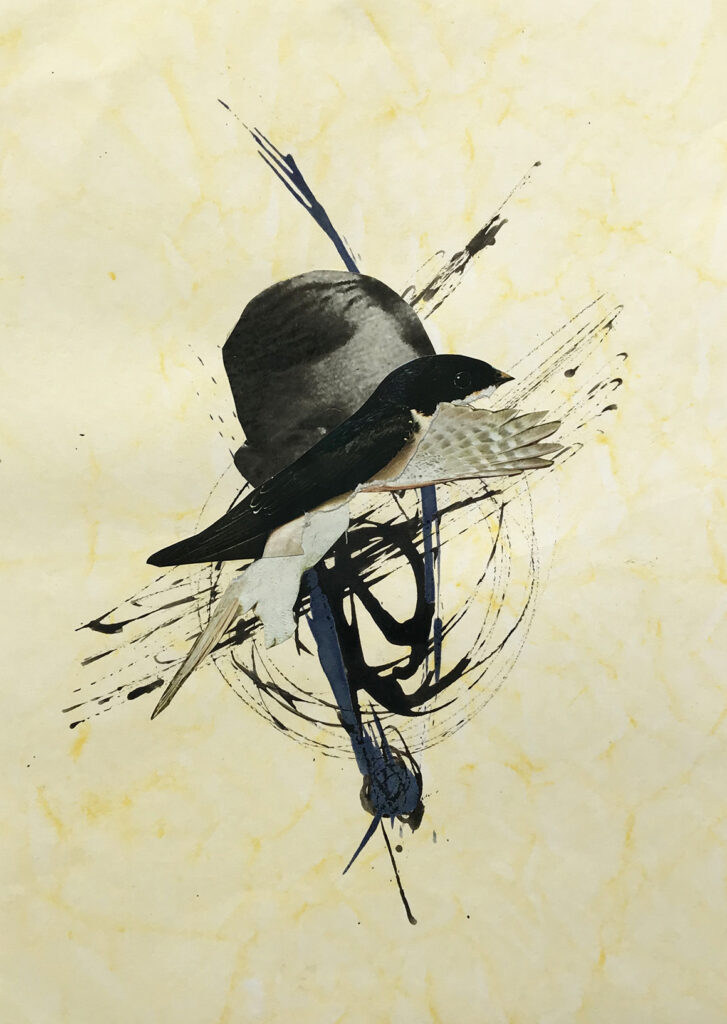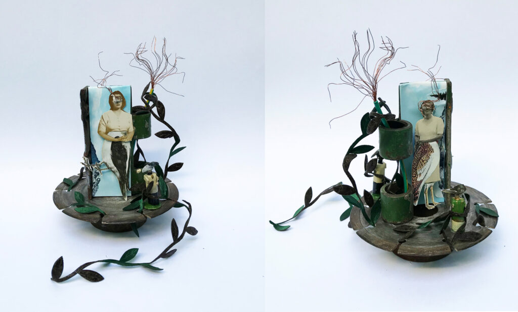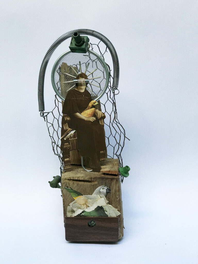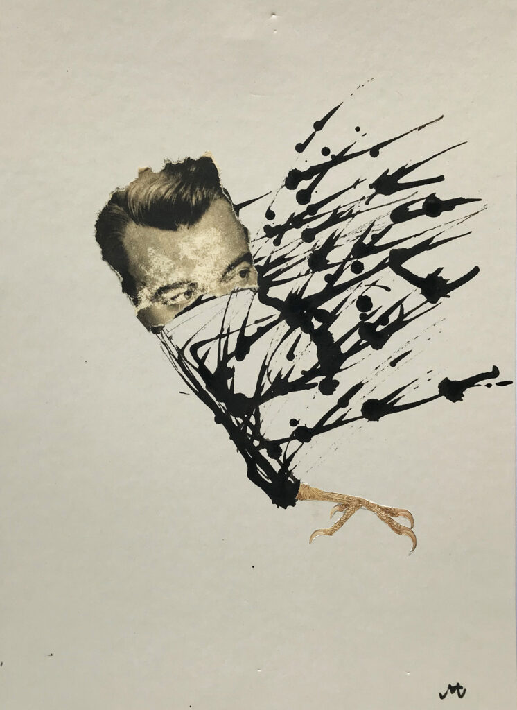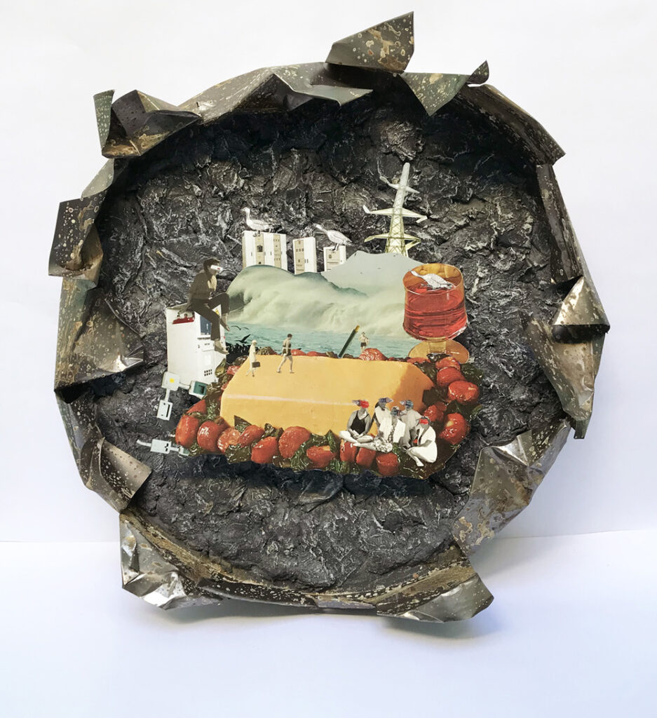 Al collage creo que llego sin darme cuenta , o sin nombrarlo. En un momento me doy cuenta que la dinámica del collage era lo que más me llamaba la atención cuando observaba obras de arte ( que no necesariamente eran collages en si mismas, pero quizás tenían algunos elementos como parte de la totalidad ) Llego desde un lugar lúdico, armando fondos y figuras y luego pegándolos sobre objetos, hasta que luego me puse a investigar en pensarlos sólo como obra, empiezo a hacer talleres, a producir muchísimo, primero solo con papel, después de un tiempo incorporo los objetos, y ya me voy al assemblage.A esto se sucedieron casi sin darme cuenta un montón de exposiciones, colectivas e individuales, festivales, etc , se abrió un mundo entero (o no tan entero, pero mundo al fin) de collage. Hoy siento que es una dinámica que siempre me acompañó simbólicamente en muchos aspectos de mi vida.