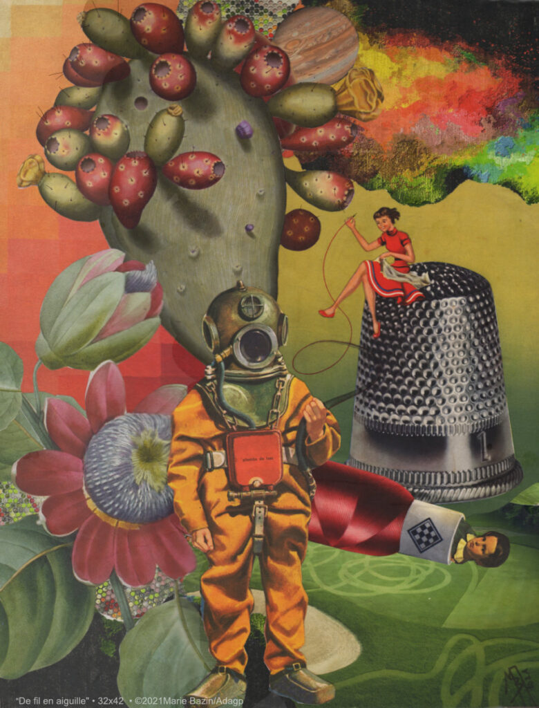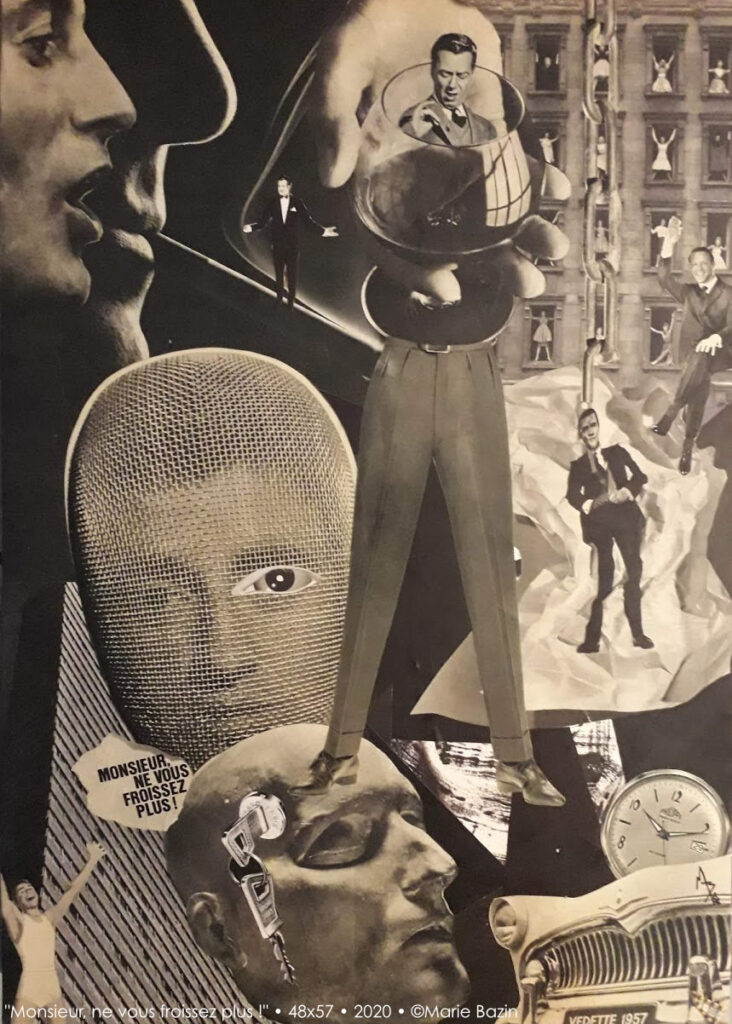 Avant tout j’aime que mes collages racontent une histoire. Celle que je me raconte en le construisant, mais aussi celle que vous vous raconterez en le voyant. Le collage permet toutes les fantaisies, l’impossible devient possible, ce qui nous amène a un versant surréaliste propre au collage. C’est un langage et un art à part entière. Le mariage des formes et des couleurs, et l’exaltante chasse au trésor qui consiste à feuilleter et sortir les personnages de leur immobilité pour leur offrir un nouveau décor, une nouvelle histoire. C’est assez jubilatoire !