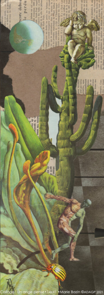 Je travaille sur divers formats, y compris très petits, ainsi que sur des supports en volumes qui offrent d’autres possibles. Je découpe ou déchire des revues et journaux anciens, véritables mines d’or, mais aussi des magazines plus récents, des livres d’images, des encyclopédies…