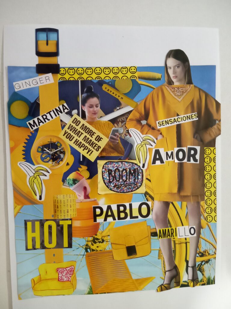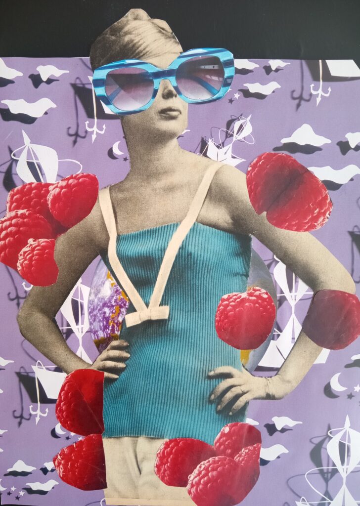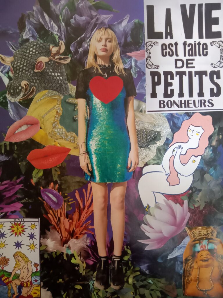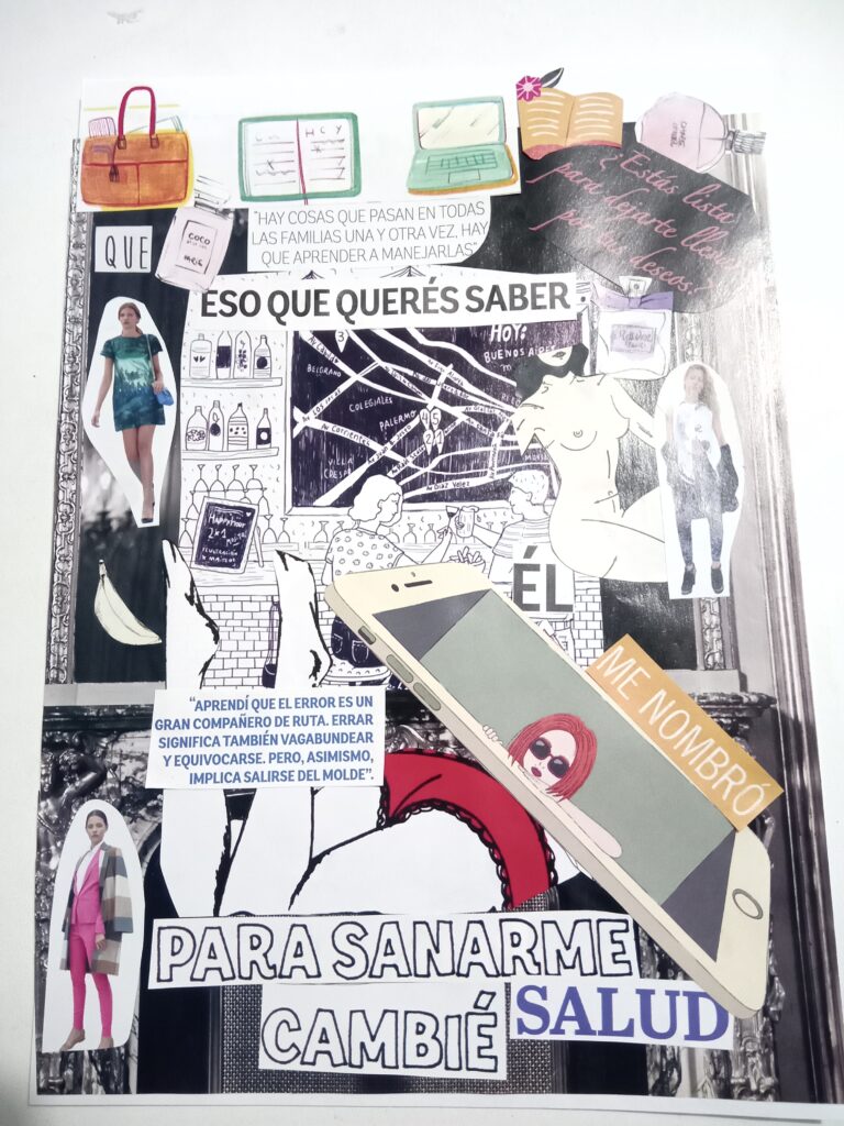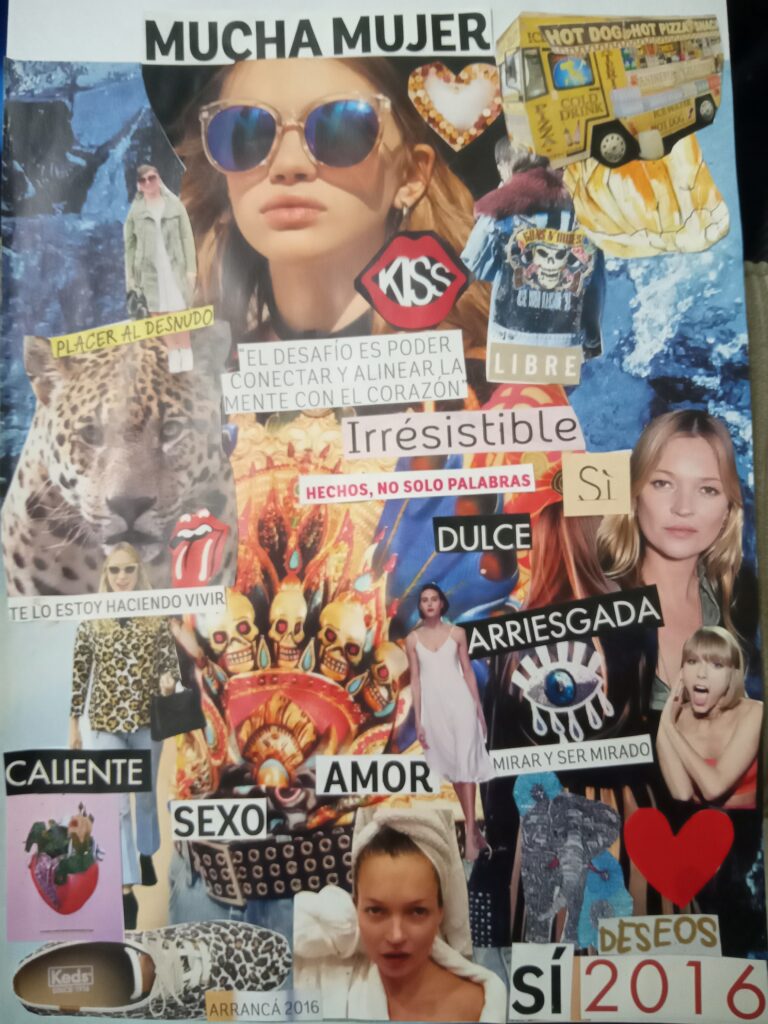 Hago collages analógicos cortando y pegando papeles. Utilizo imagenes y palabras de revistas en mis composiciones. Mis obras son vibrantes y llamativas, tienen mucho para contar, cada una representa diferentes sentimientos, momentos y cosas que me fueron pasando.