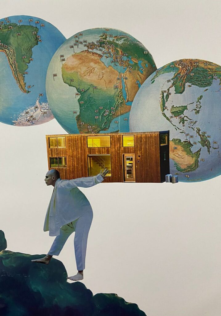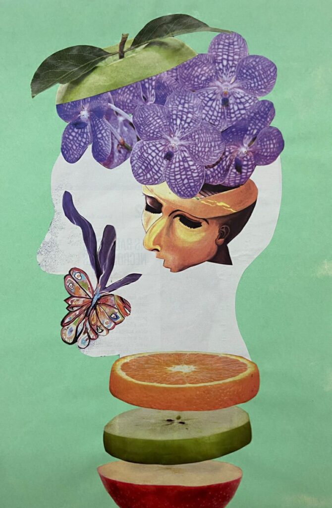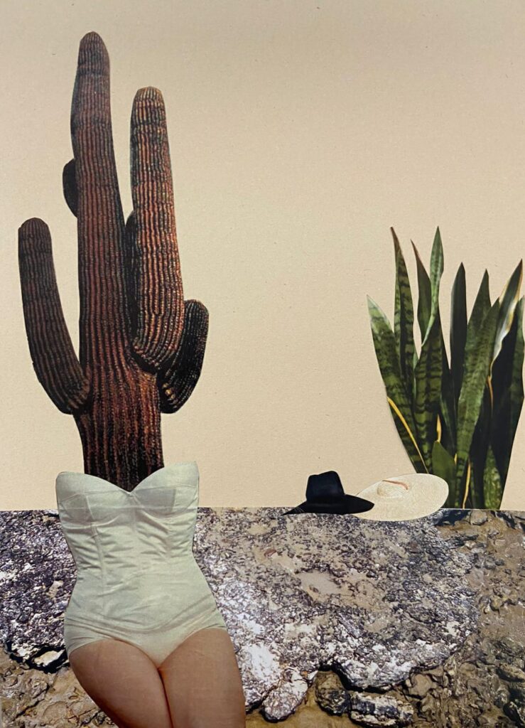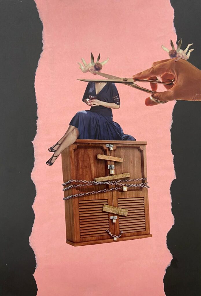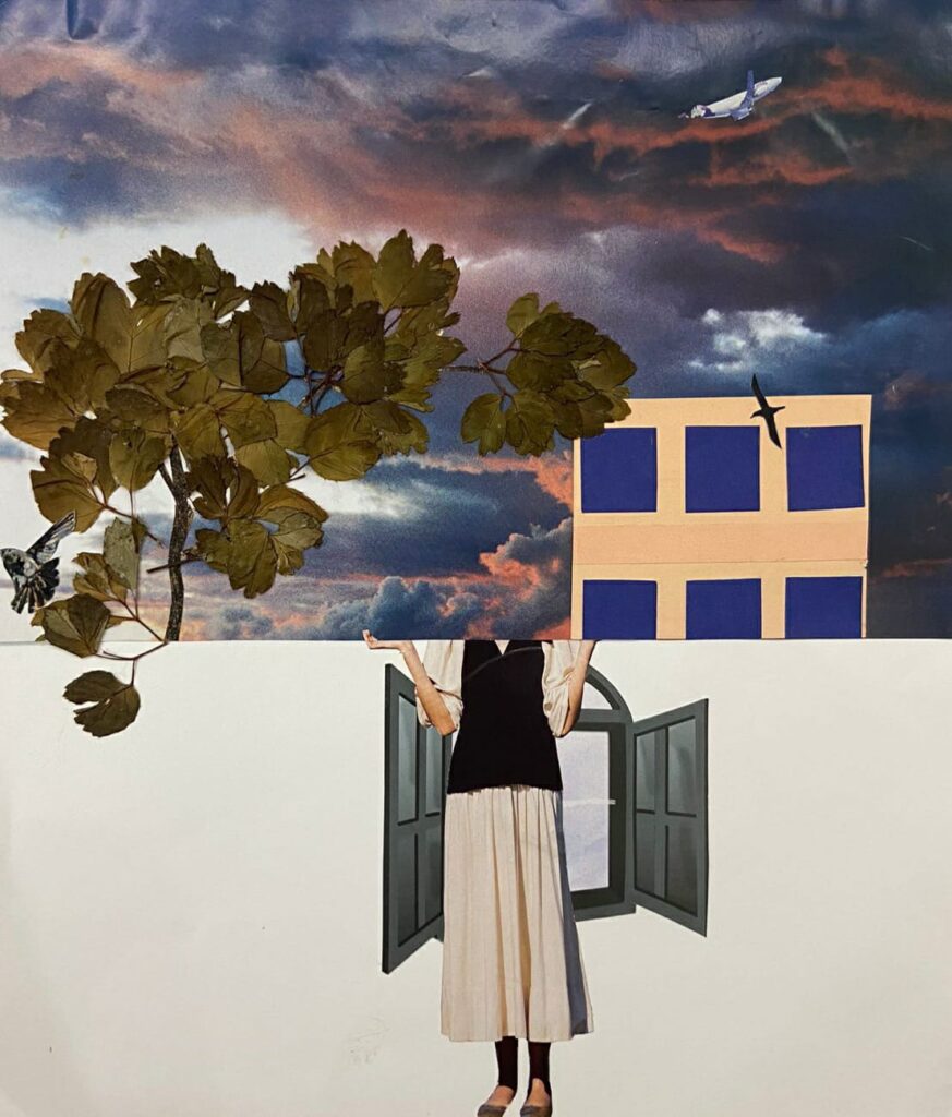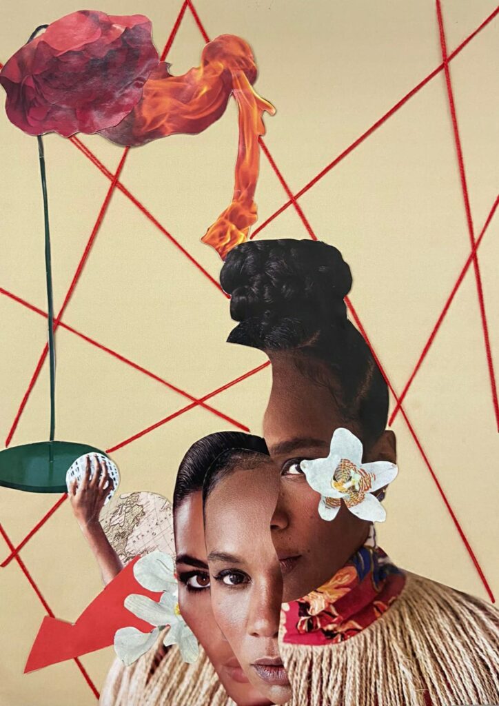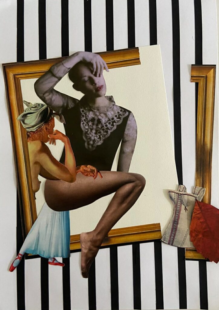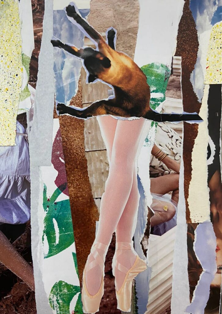 Faço colagens analógicas. Gosto do contato com o papel e suas diferentes texturas. Minhas colagens são maneiras de “poetizar”. Meus trabalhos contam histórias e propõem muitas possibilidades de narrativa. Busco retratar nas formas e cores dos meus recortes, nas combinações e “descombinações”, a expressão de liberdade que eu mesma necessito. É um ato de saída do raso e daquilo que sufoca, é um desejo de dialogar com um mundo que abarque todas as possibilidades.