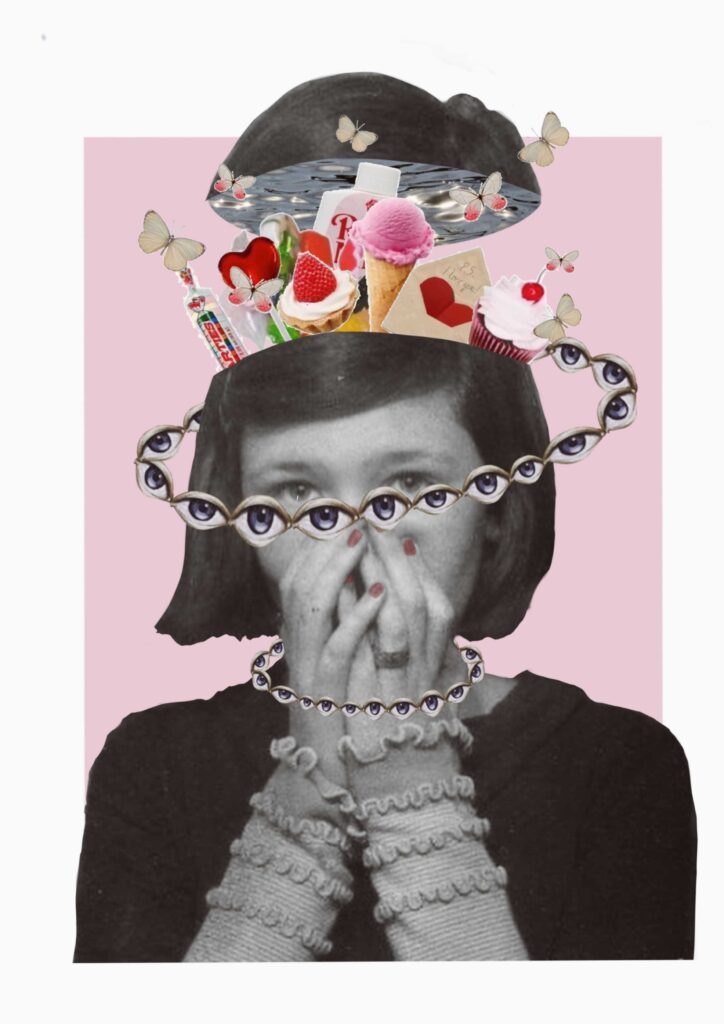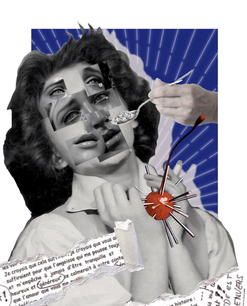 My work carries a critical perspective. I am particularly drawn to exploring women’s issues, psychological phenomena, emotions, dilemmas, and acts of resistance through collage. I also often integrate abstract philosophical theories into my practice, allowing them to open up new ways of expressing complex ideas. To me, collage is like a series of visual poems: fragments come together to form new narratives and atmospheres. Although I am still at the beginning of my creative journey, I hope to continue developing this practice, exploring further, and creating more playful and thought-provoking works.